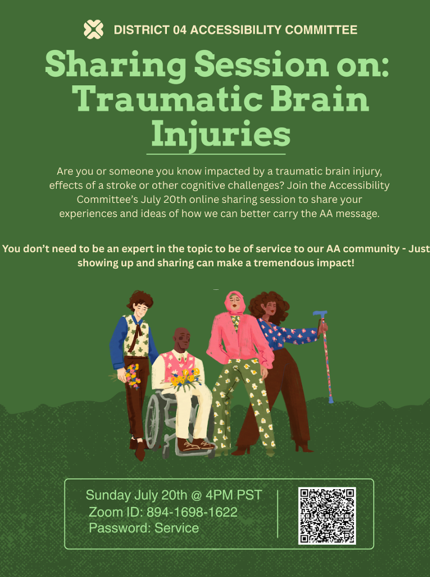 The vision of the Accessibility Committee is to work in close collaboration with other districts and key committees to improve our effectiveness in serving alcoholics who face barriers to accessing the A.A. message, helping them to carry the message to other alcoholics, and providing powerful examples of the possibility of achieving sobriety in spite of access barriers.