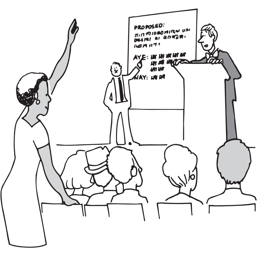 1) Presentation of New Business – This is where the maker of the motion presents the motion. We ask questions about the intent of the motion only.